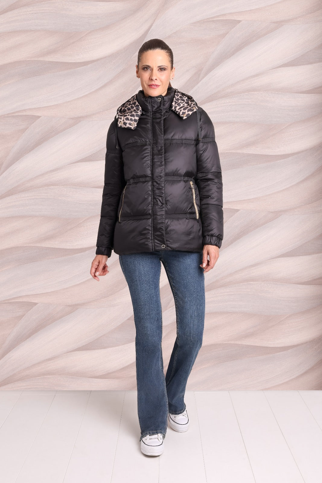 Blusão acolchoado preto, de comprimento médio, com gola subida e detalhe de padrão animal na gola. Costuras acolchoadas horizontais, manga comprida, bolsos laterais com fecho metálico e fecho frontal de correr.