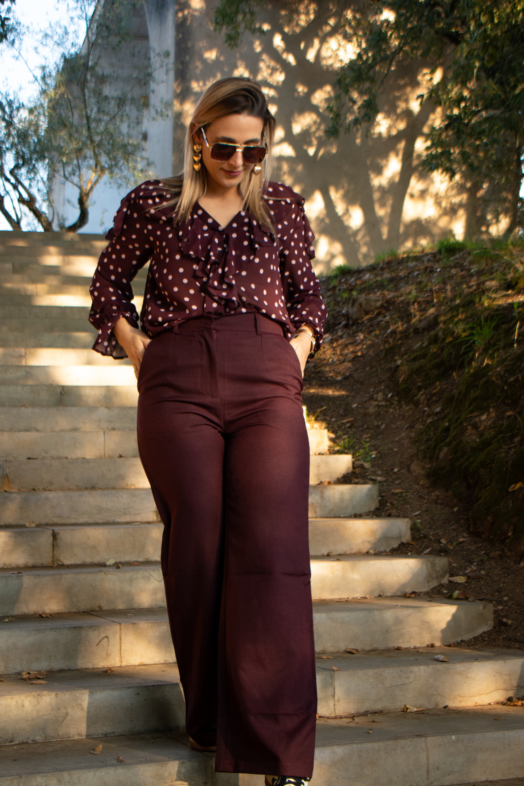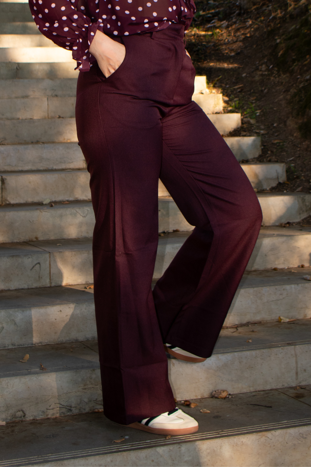 Calças de corte elegante e contemporâneo. O design apresenta cintura alta, que ajuda a definir a silhueta, e uma perna larga. Possui bolsos laterais discretos e fecho frontal.