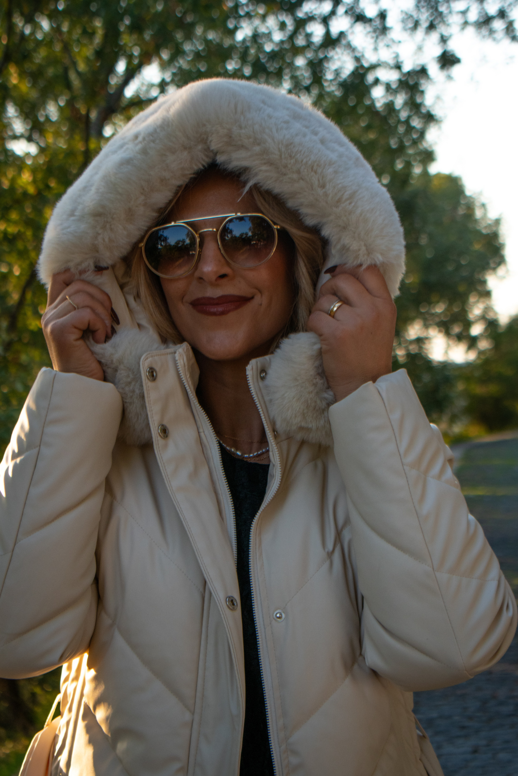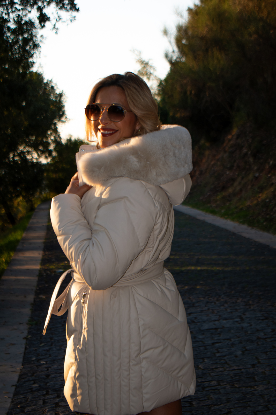 Blusão acolchoado em efeito pele, de comprimento médio, com capuz e aplicação de pelo sintético. Pesponto em chevron, manga comprida, cinto para ajustar a cintura, bolsos laterais com fecho e fecho frontal com fecho de correr e aba com molas de pressão.