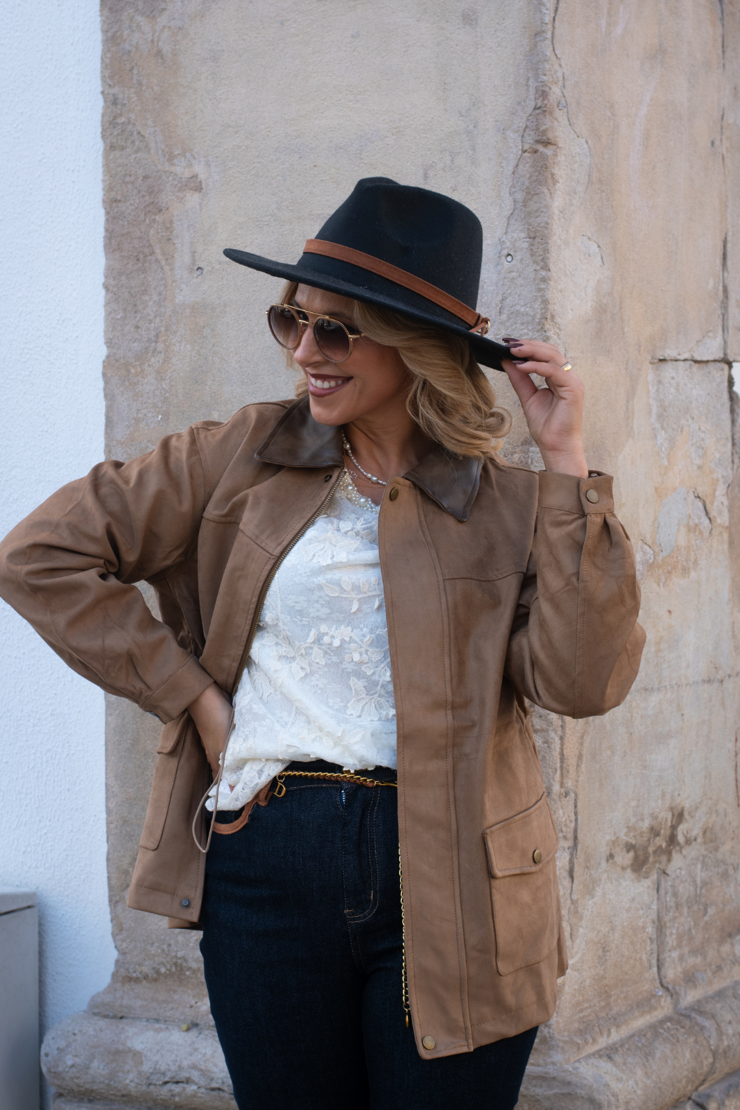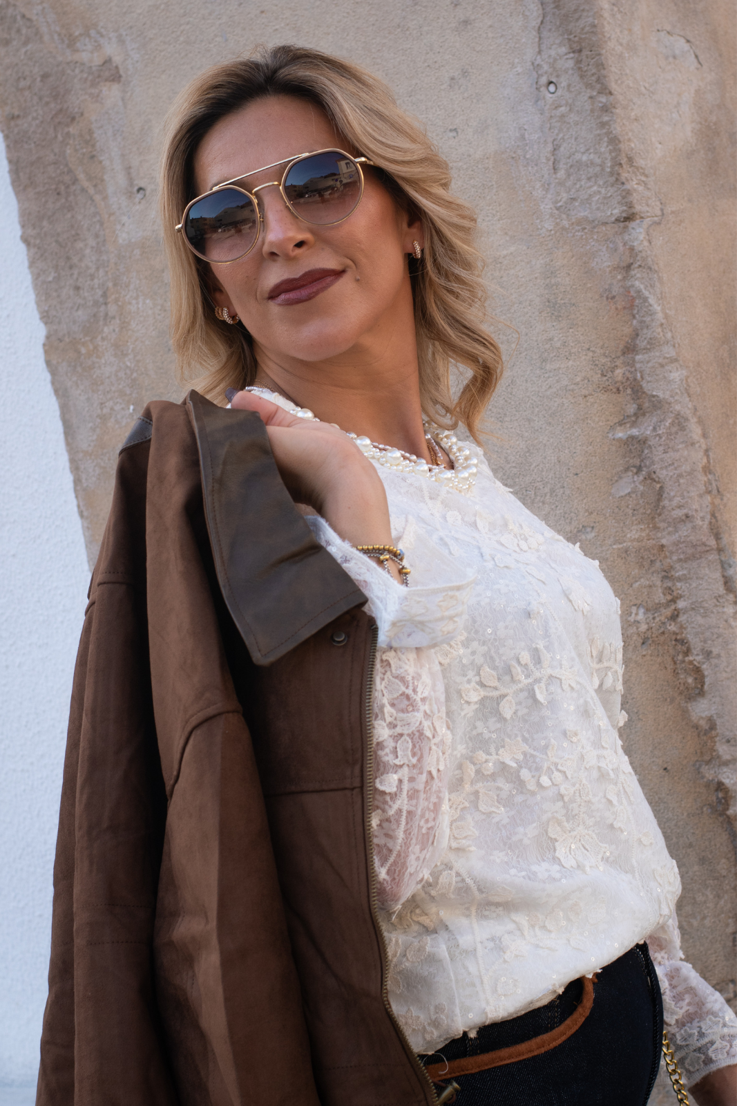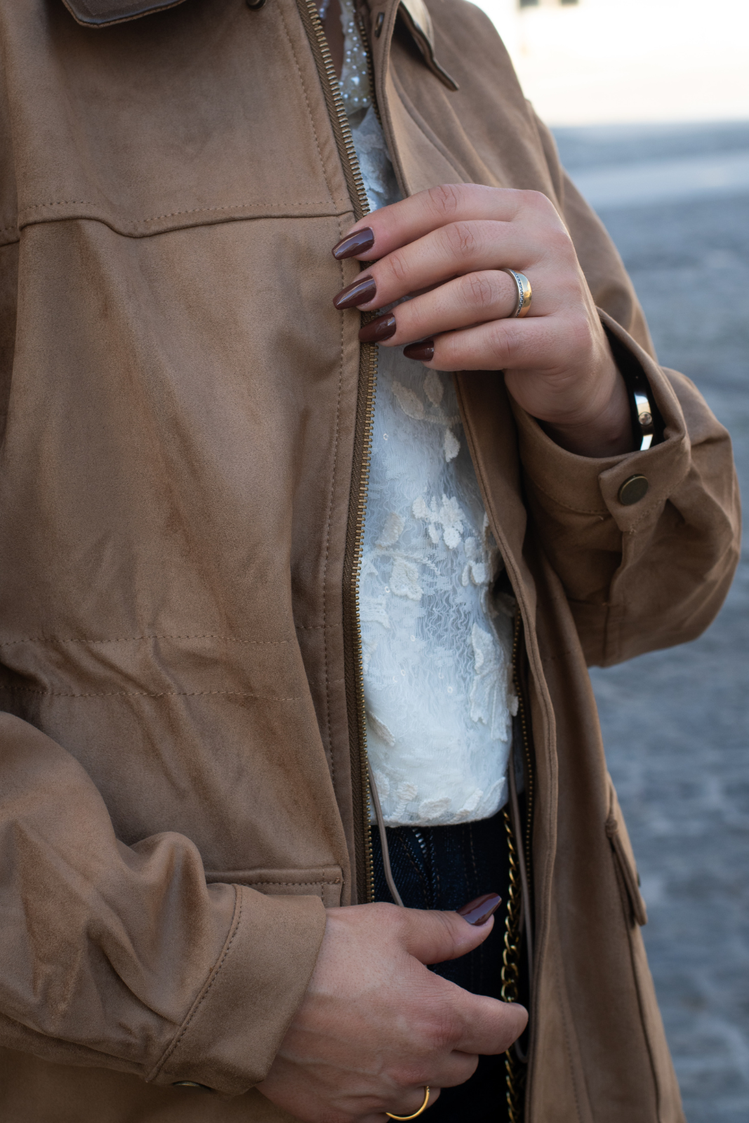 Casaco em efeito camurça, com gola camiseiro. Fecho frontal com zip, bolsos frontais com pala e molas de pressão e punhos com mola. Cintura ajustável por cordão interior para definir a silhueta. Corte confortável e comprimento médio.