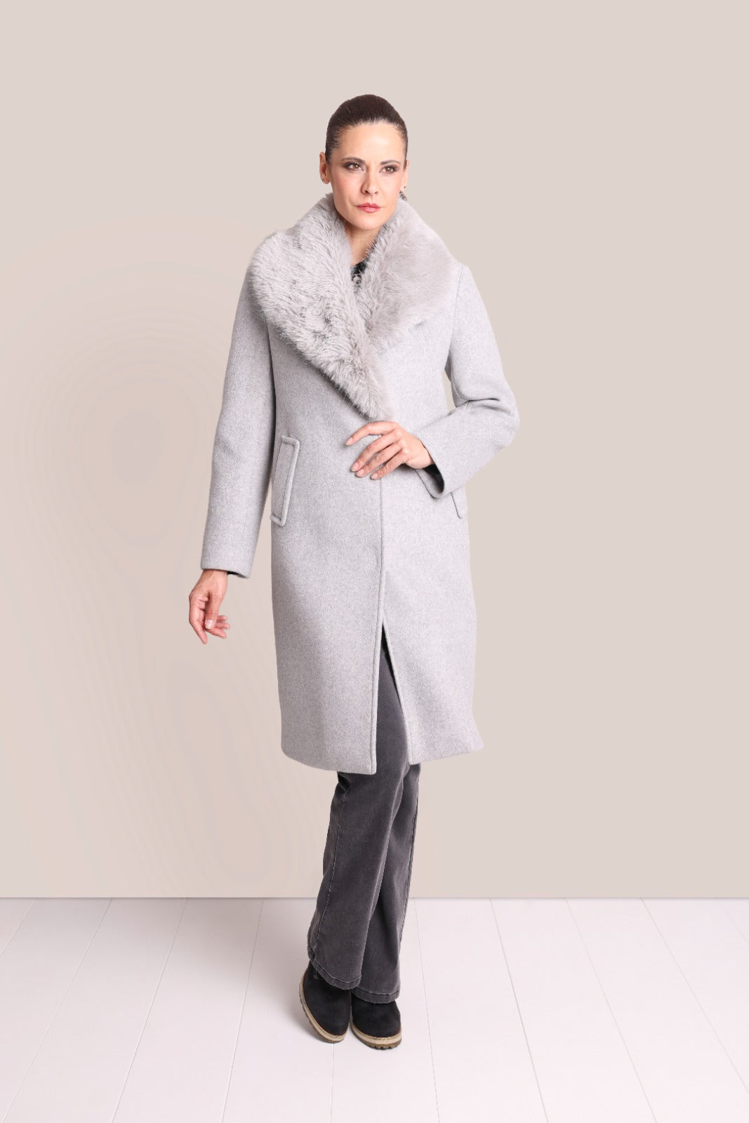 Casaco comprido em tecido efeito lã. Gola ampla com aplicação de pelo sintético e manga comprida. Bolsos frontais de vivo. Fecho frontal oculto.