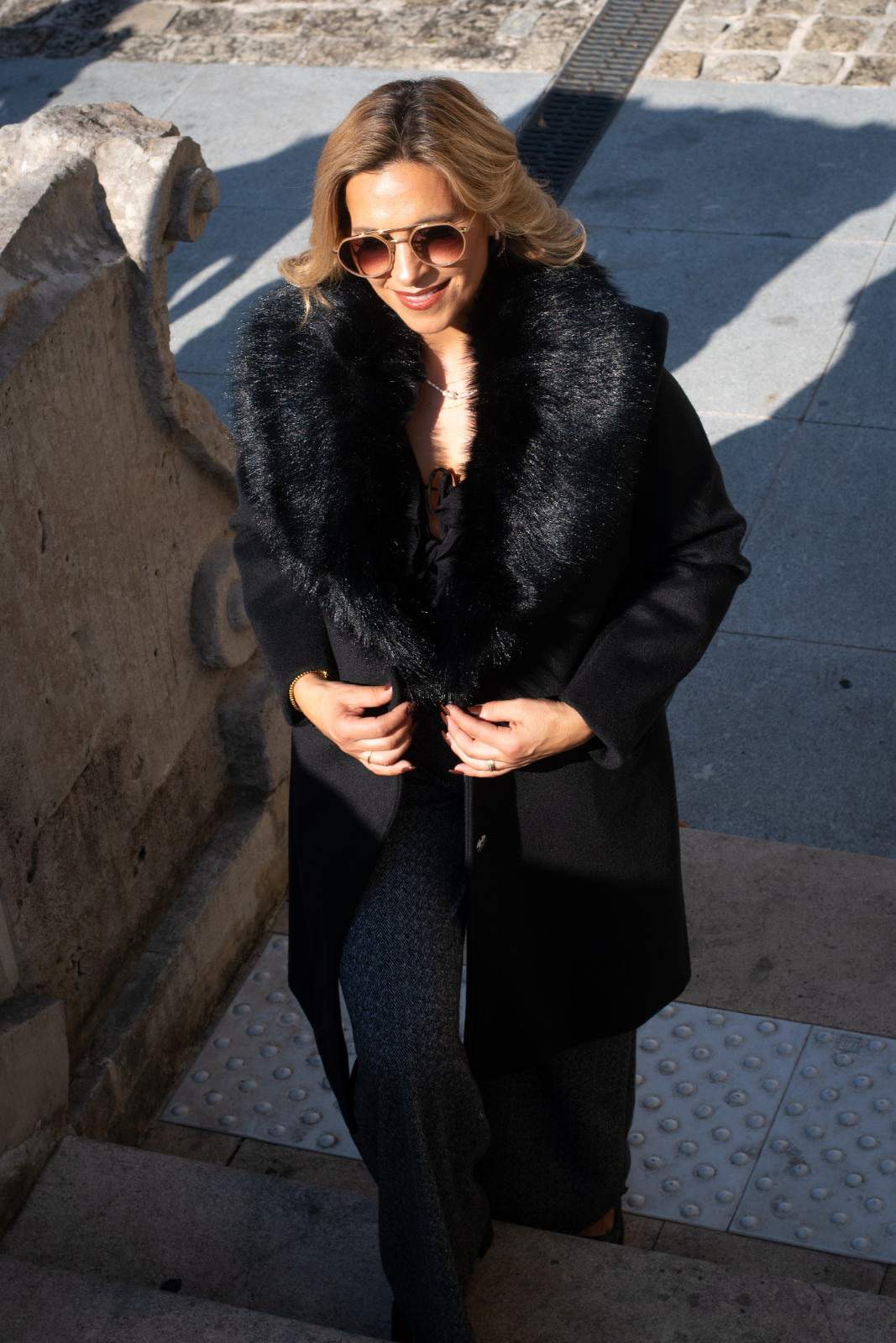 Casaco comprido em tecido efeito lã. Gola ampla e envolvente com aplicação de pelo sintético, manga comprida e corte direito com leve estrutura na cintura. Fecho frontal oculto e bolsos laterais discretos. Elegante e quente para os dias frios.