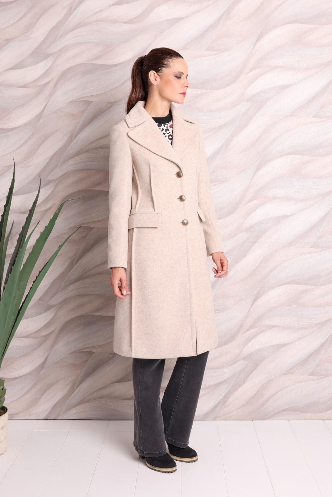 Casaco comprido em tecido efeito lã, tom bege, com gola de lapelas e manga comprida. Linha cintada com costuras modeladoras, bolsos frontais com pala e aperto frontal com três botões.