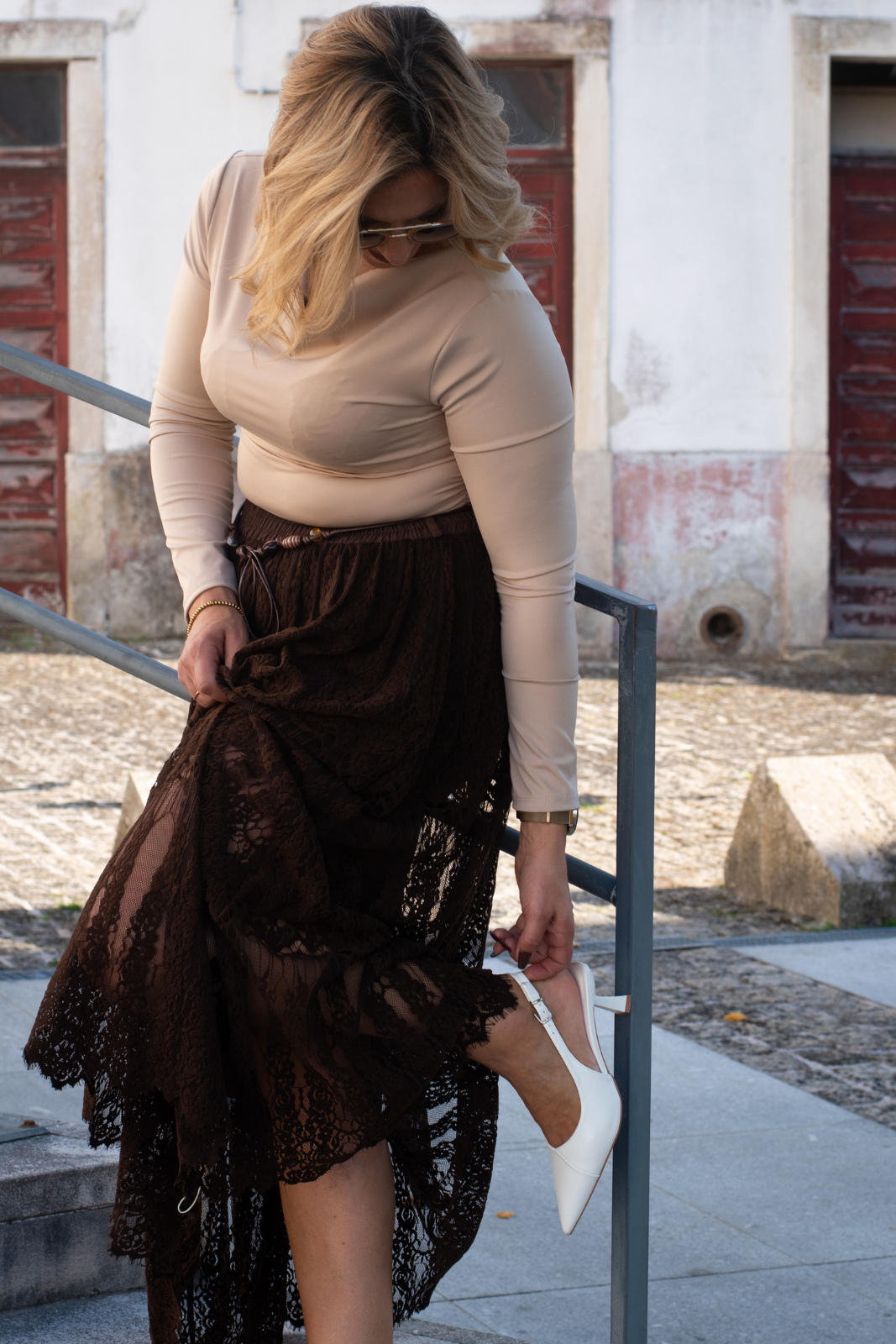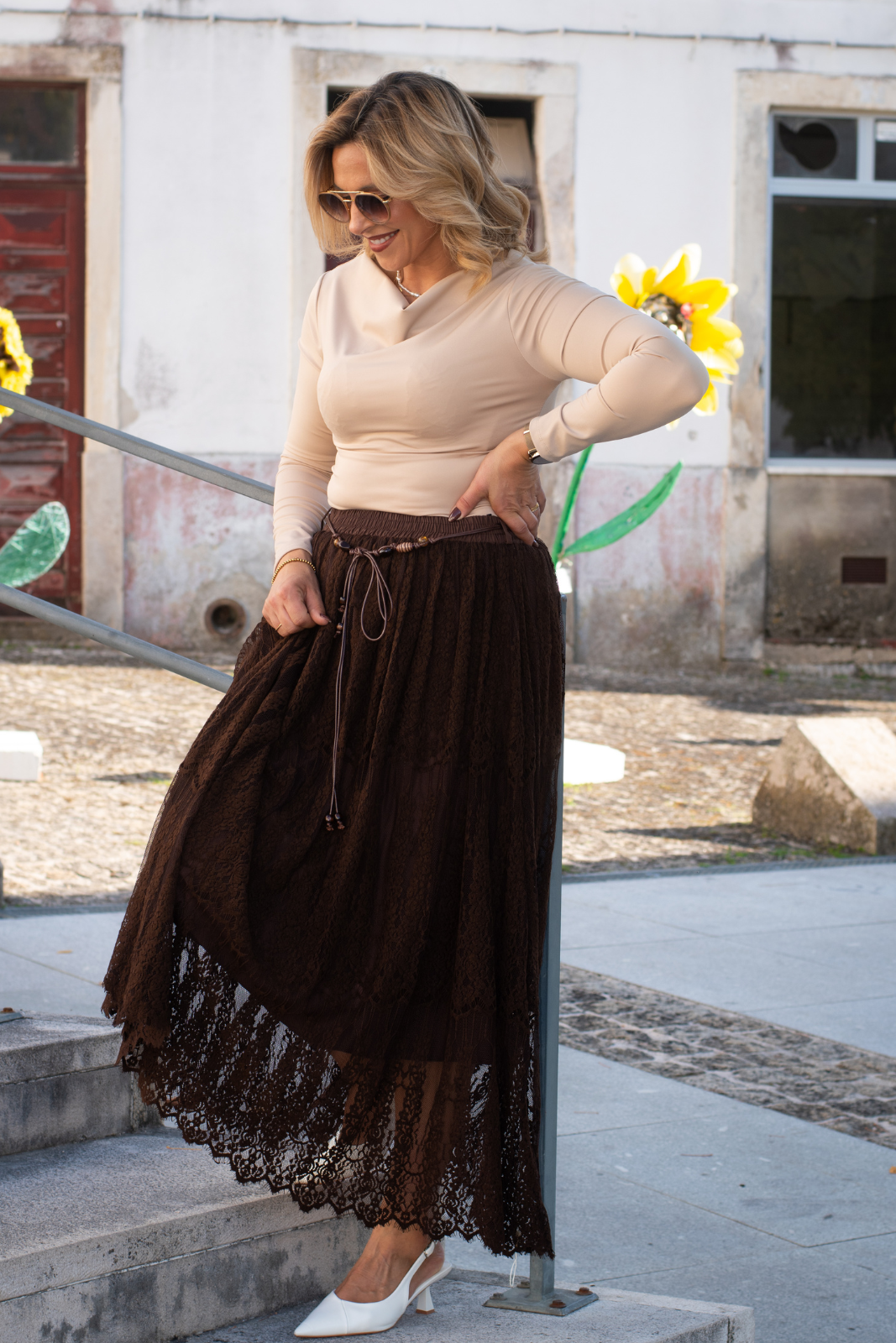 Saia longa em renda castanha, leve e fluida. Cintura confortável com elástico e cinto de cordão removível com ponteiras e forro interno. Bainha rendada com recorte ondulado. Peça versátil para coordenar com camisas ou camisolas.