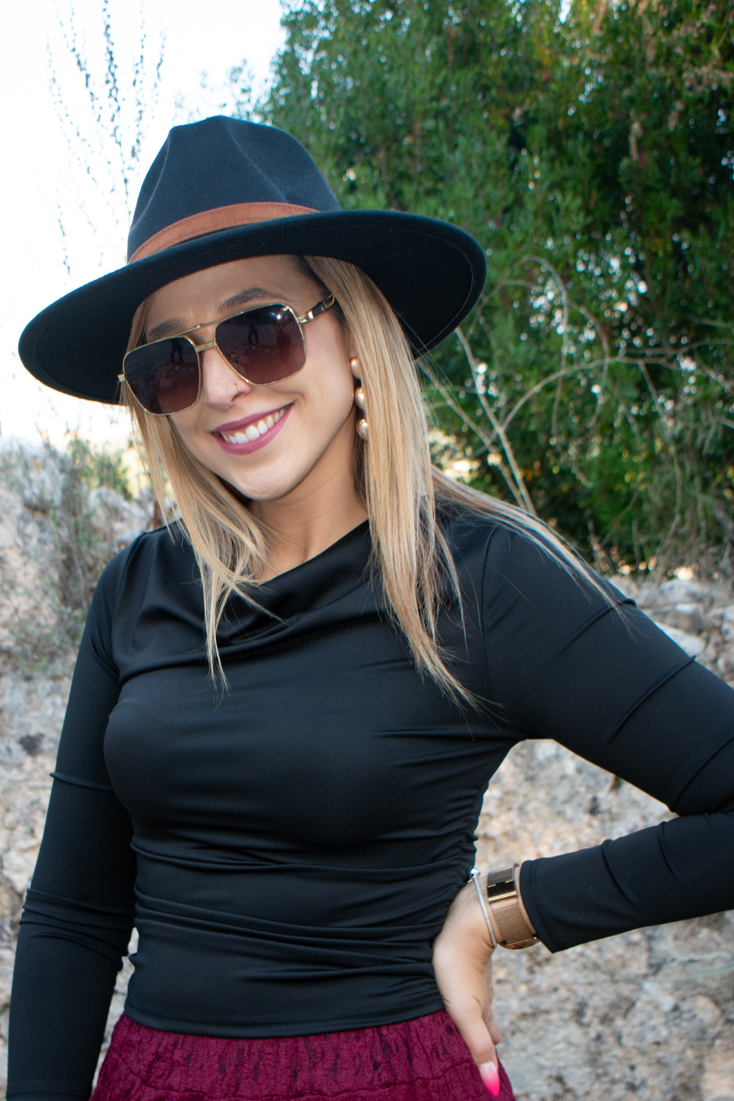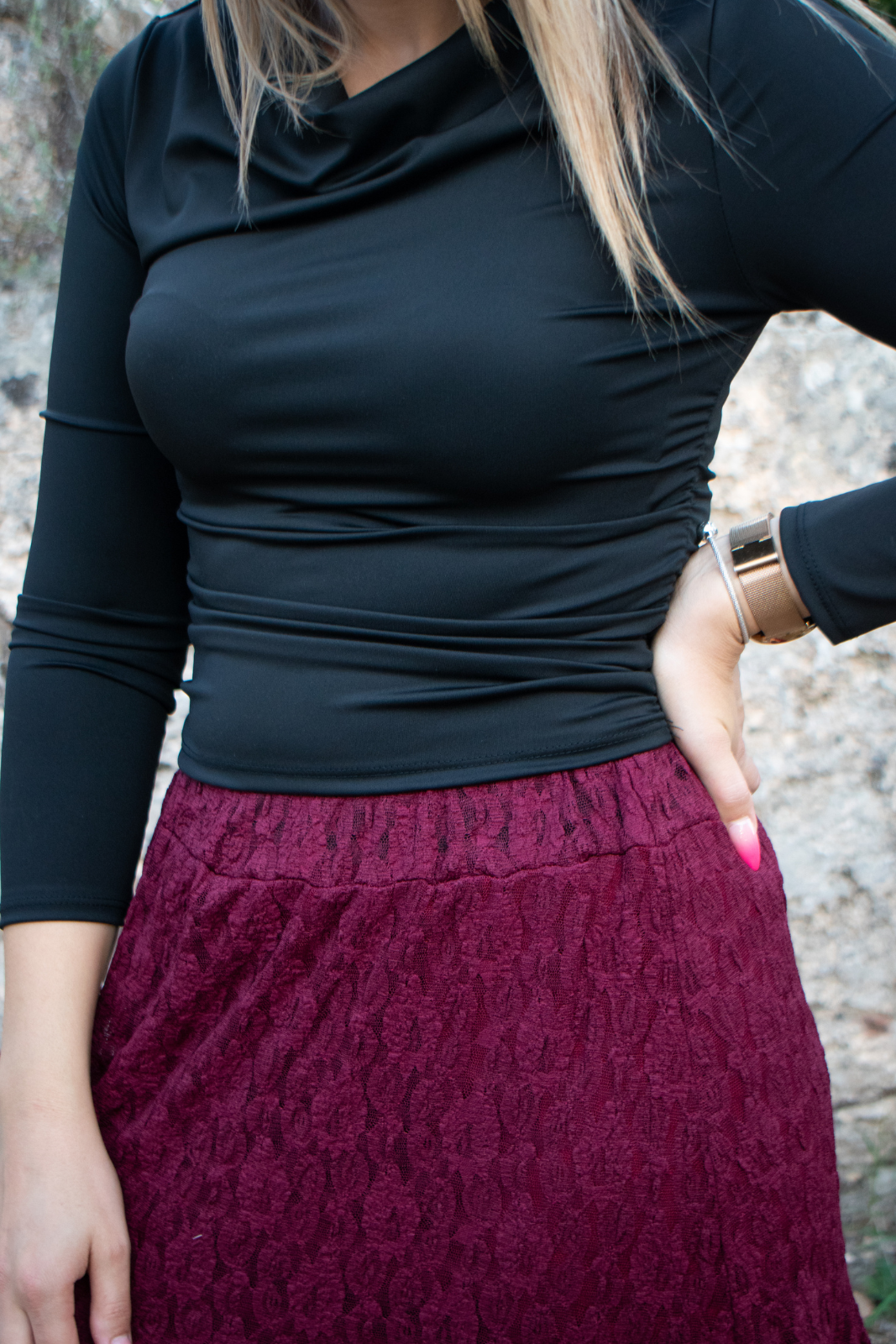 Top manga comprida justa em tecido liso e elástico (tipo jersey). Decote drapeado, manga comprida e franzidos laterais que definem a cintura. Comprimento regular; fácil de combinar com saias e calças.